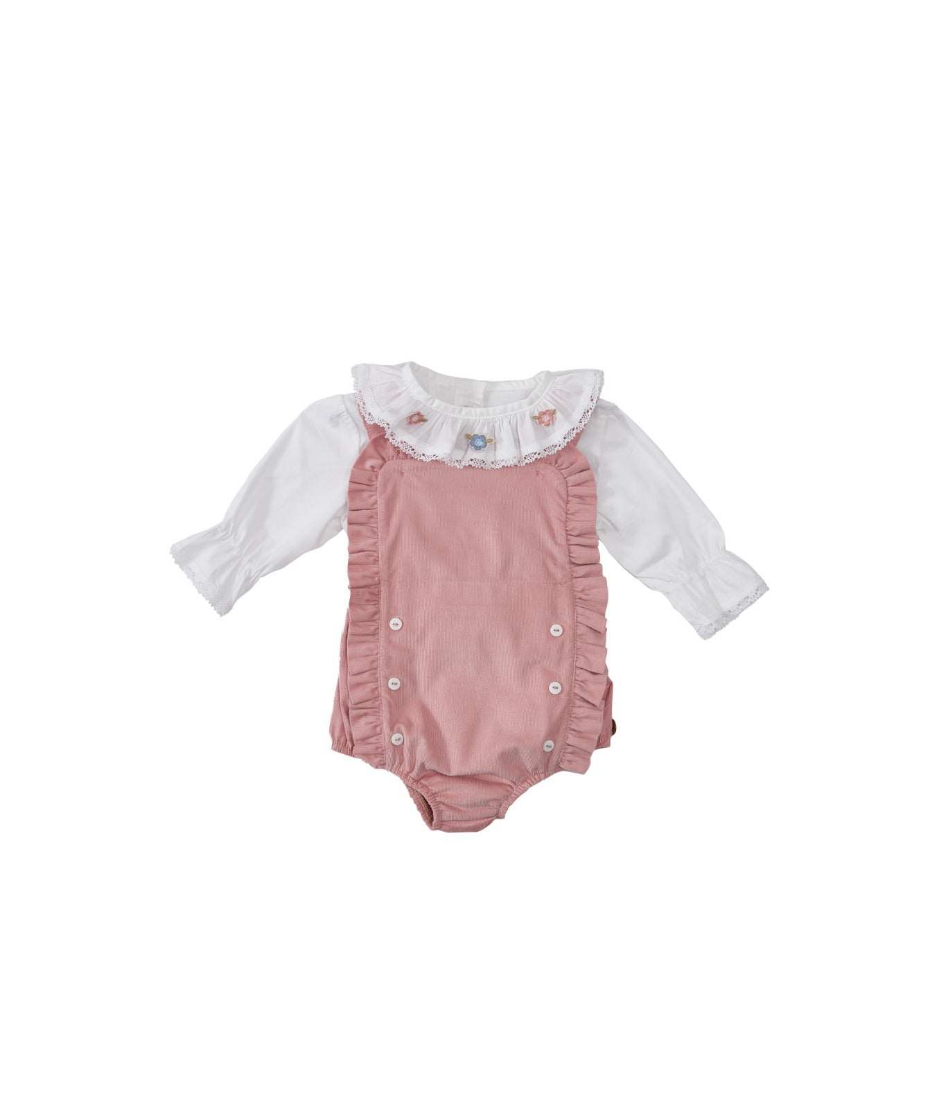 Apresentamos o adorável conjunto Sophia com a jardineira confeccionada em Veludo camisaria, e a blusa com babados rendas e bordados a escolha perfeita para vestir seu bebê com estilo e conforto em eventos especiais, como mesversários e eventos festivos. Confeccionada em tecido de alta qualidade, essa jardineira oferece maciez e benefícios para a pele delicada do bebê.