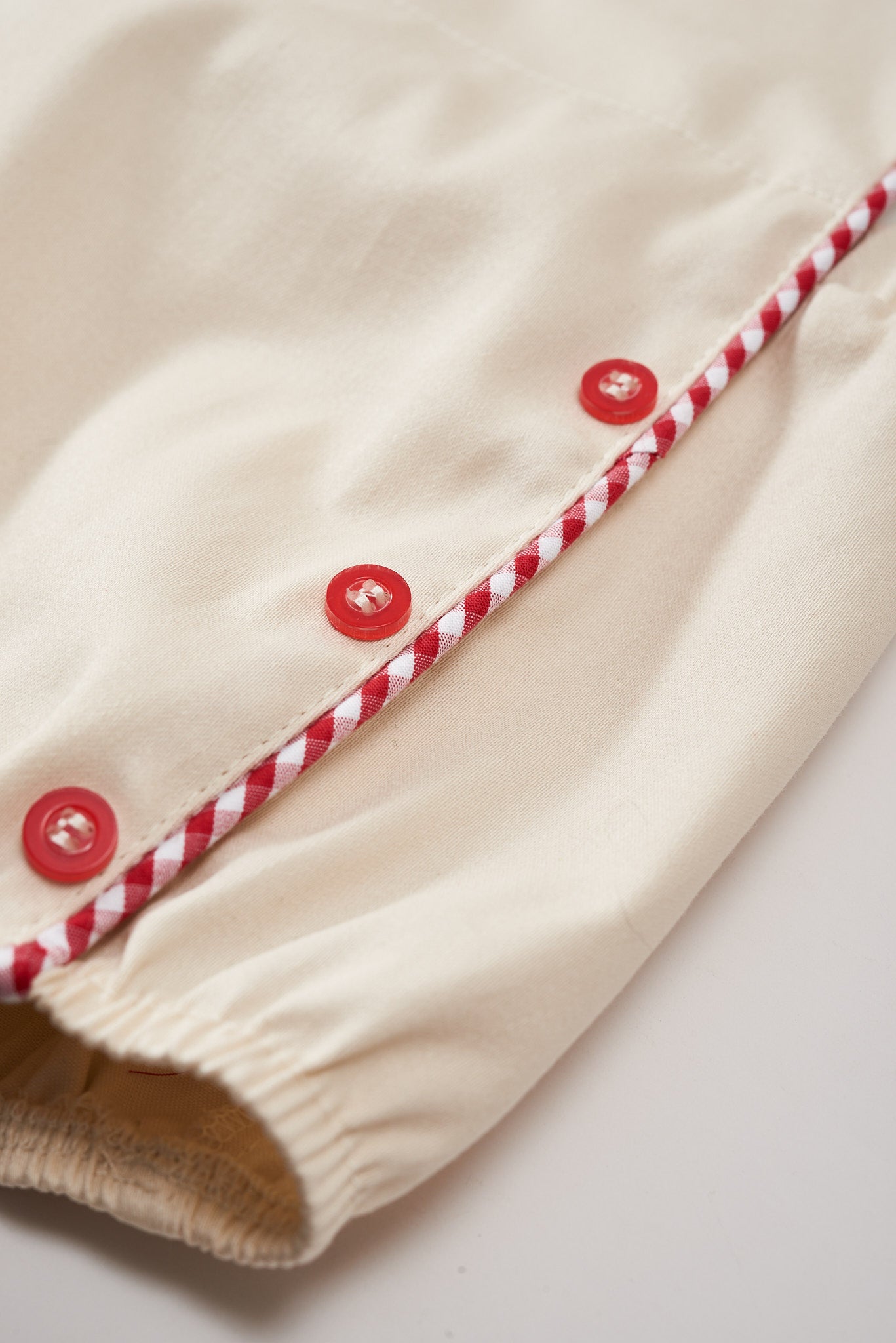 Tecido: Sarja (Bege com Vermelho e Azul Royal) - 97% Algodão | 3% Elastano.