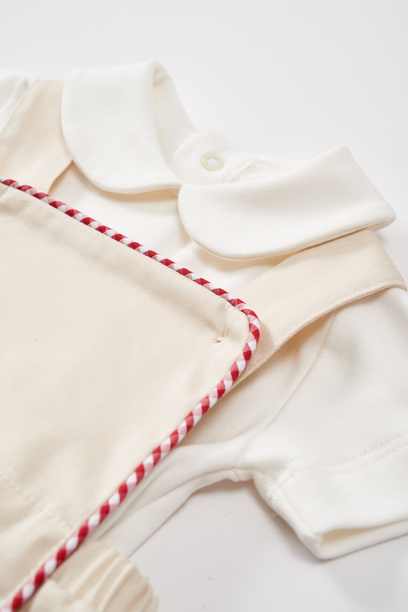 Jardineira possui modelagem clássica além dos detalhes, com friso na lateral e botões frontais, é confeccionada em sarja, tecido que garantem respirabilidade e conforto para o bebê.