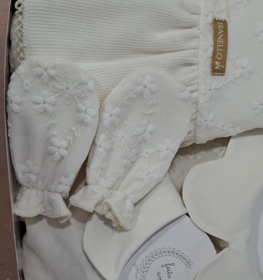 Nosso kit de luvas em renda Bianello é confeccionado com tecidos suaves e respiráveis, garantindo conforto e segurança para a pele sensível do recém-nascido. Um toque clássico e sofisticado ao enxoval.