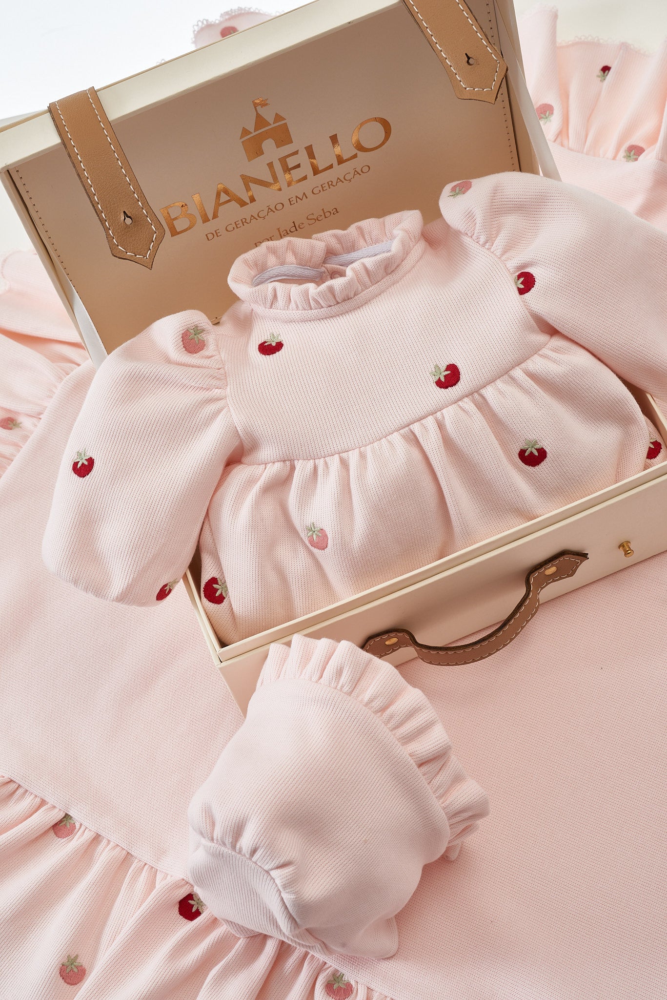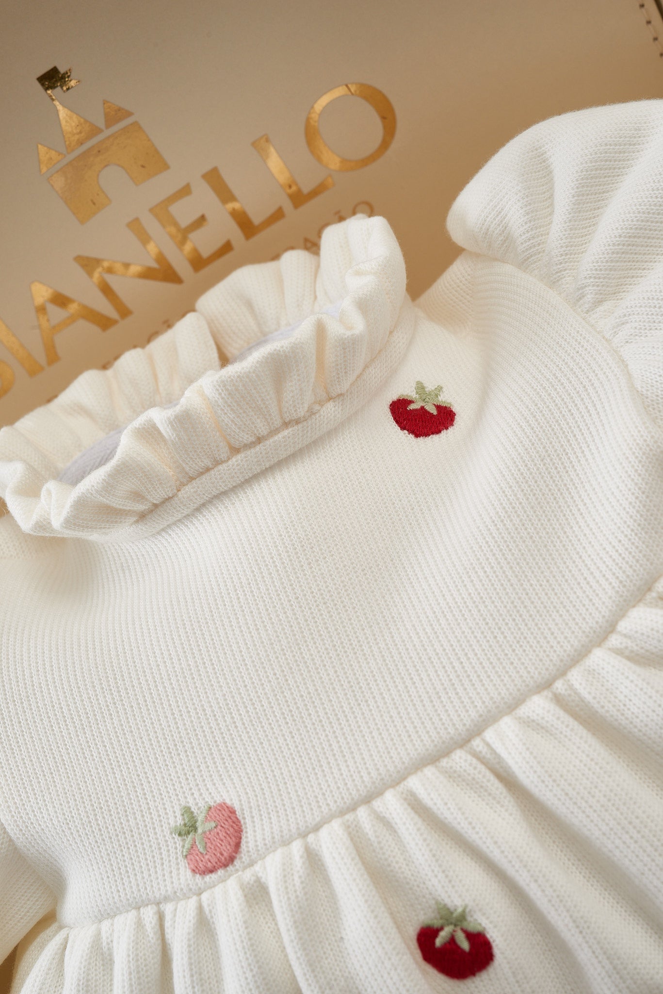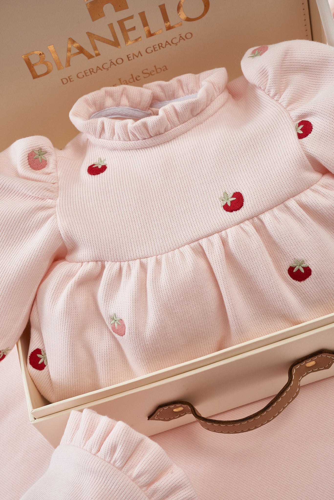 Macacões com bordados delicados de moranguinhos, possui um babadinho leve no decote, mangas bufantes.