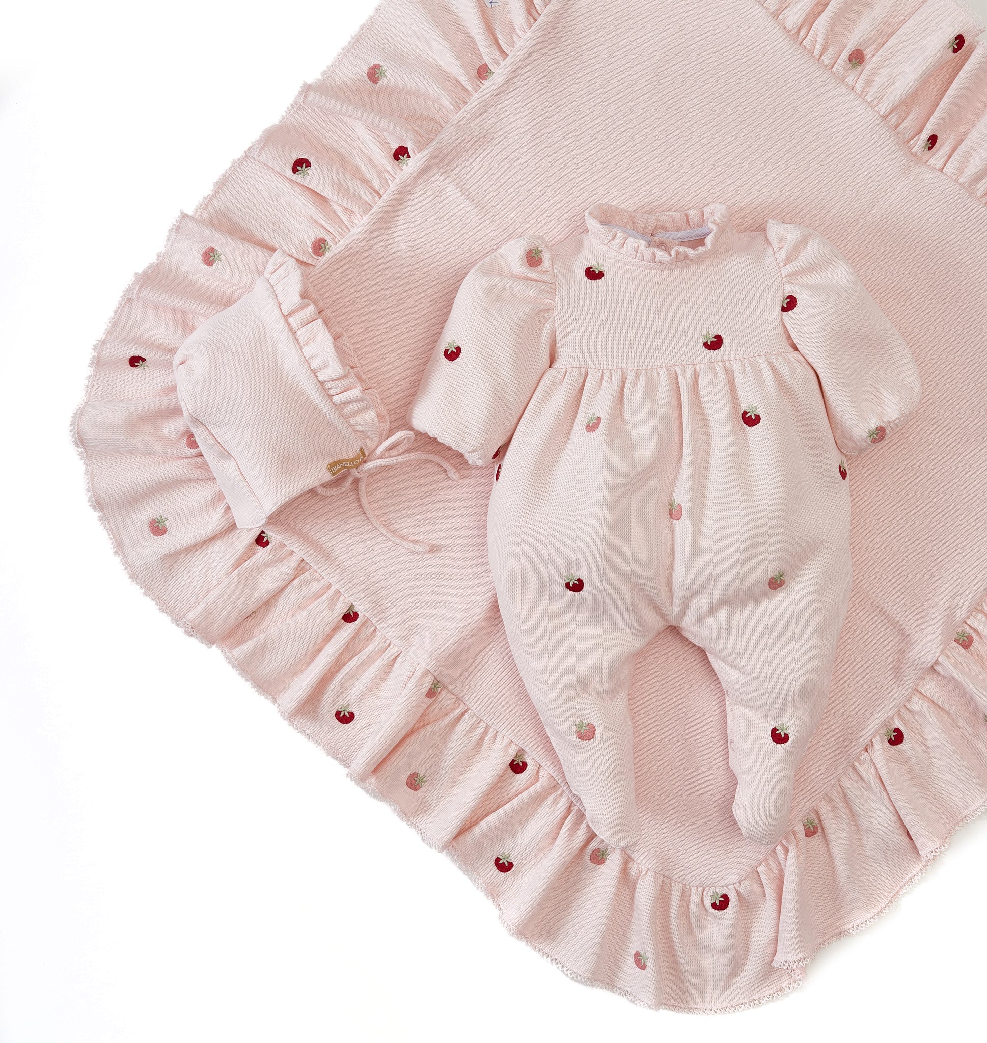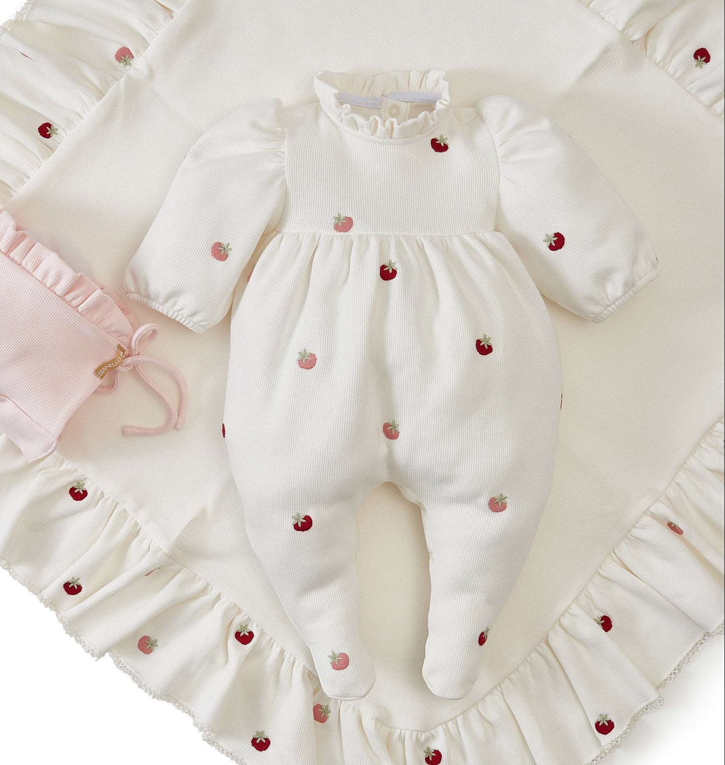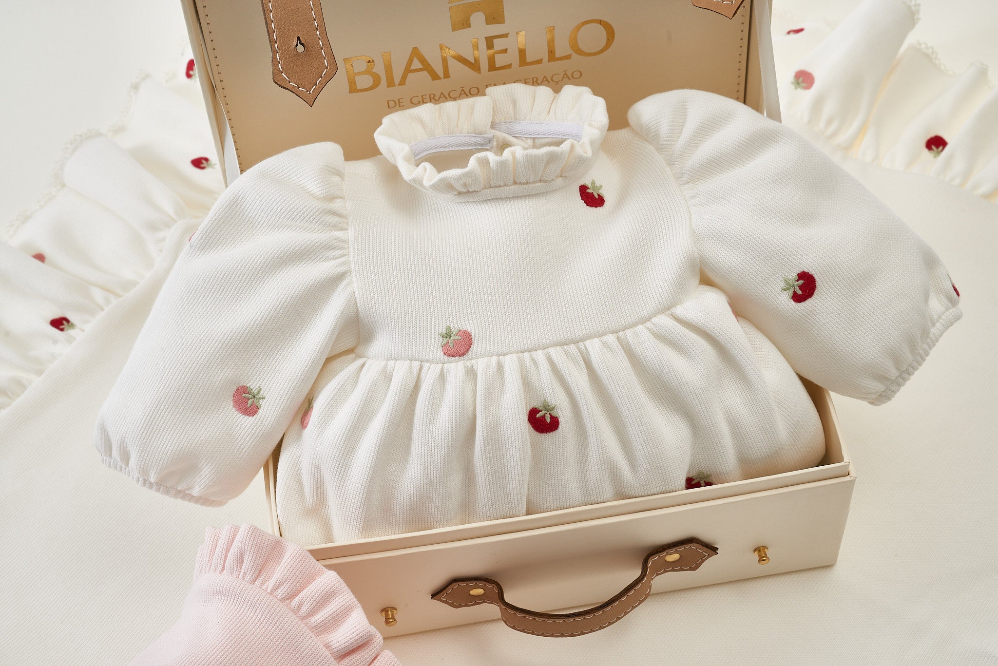 Macacões com bordados delicados de moranguinhos, possui um babadinho leve no decote, mangas bufantes.