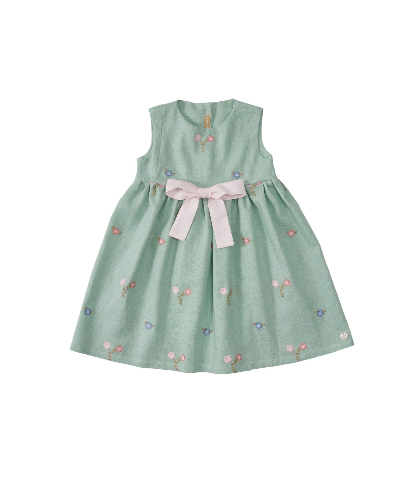 O vestido Clarice se destaca com o tecido todo bordado com florzinhas coloridas, criando uma composição alegre e vibrante.