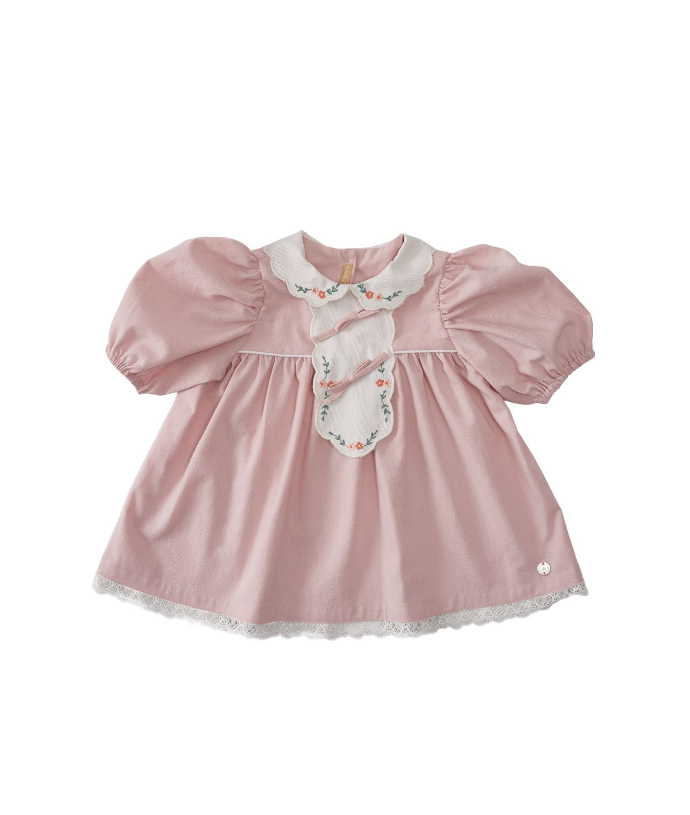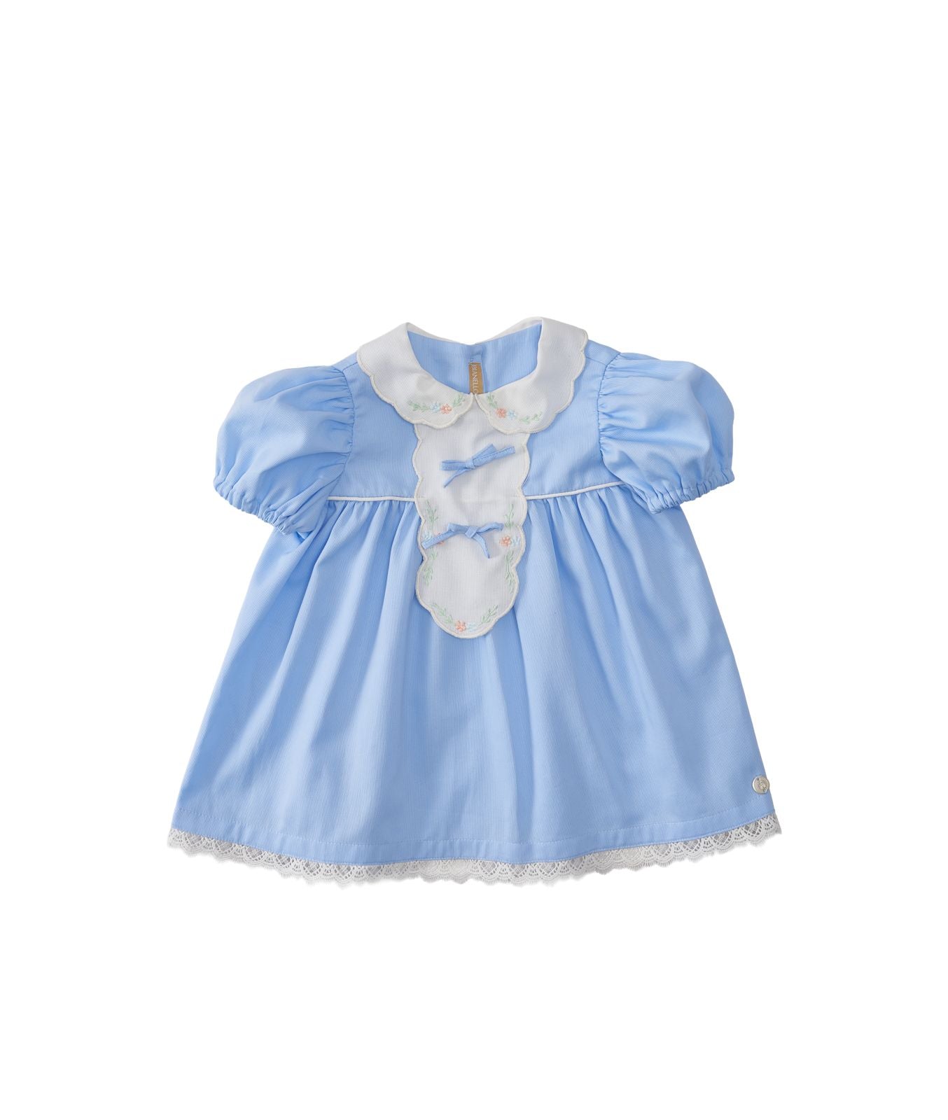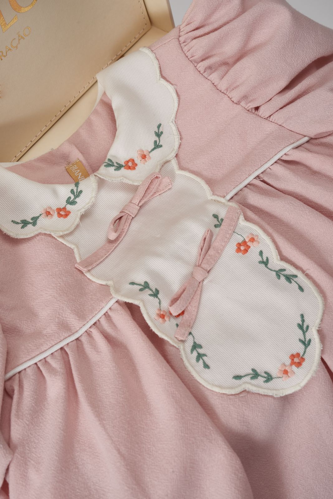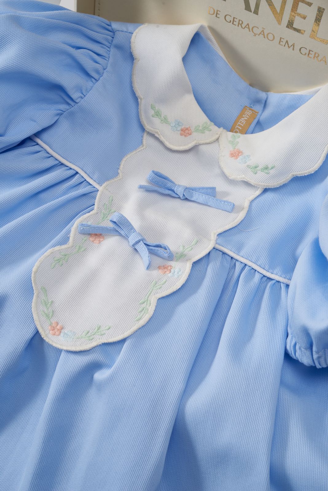 Nosso Vestido Monalisa Clássico combina delicadeza e sofisticação em cada detalhe. Com design retrô e acabamento impecável, ele traz gola bordada, aplicação de laços e manga bufante que adicionam um charme atemporal à peça.